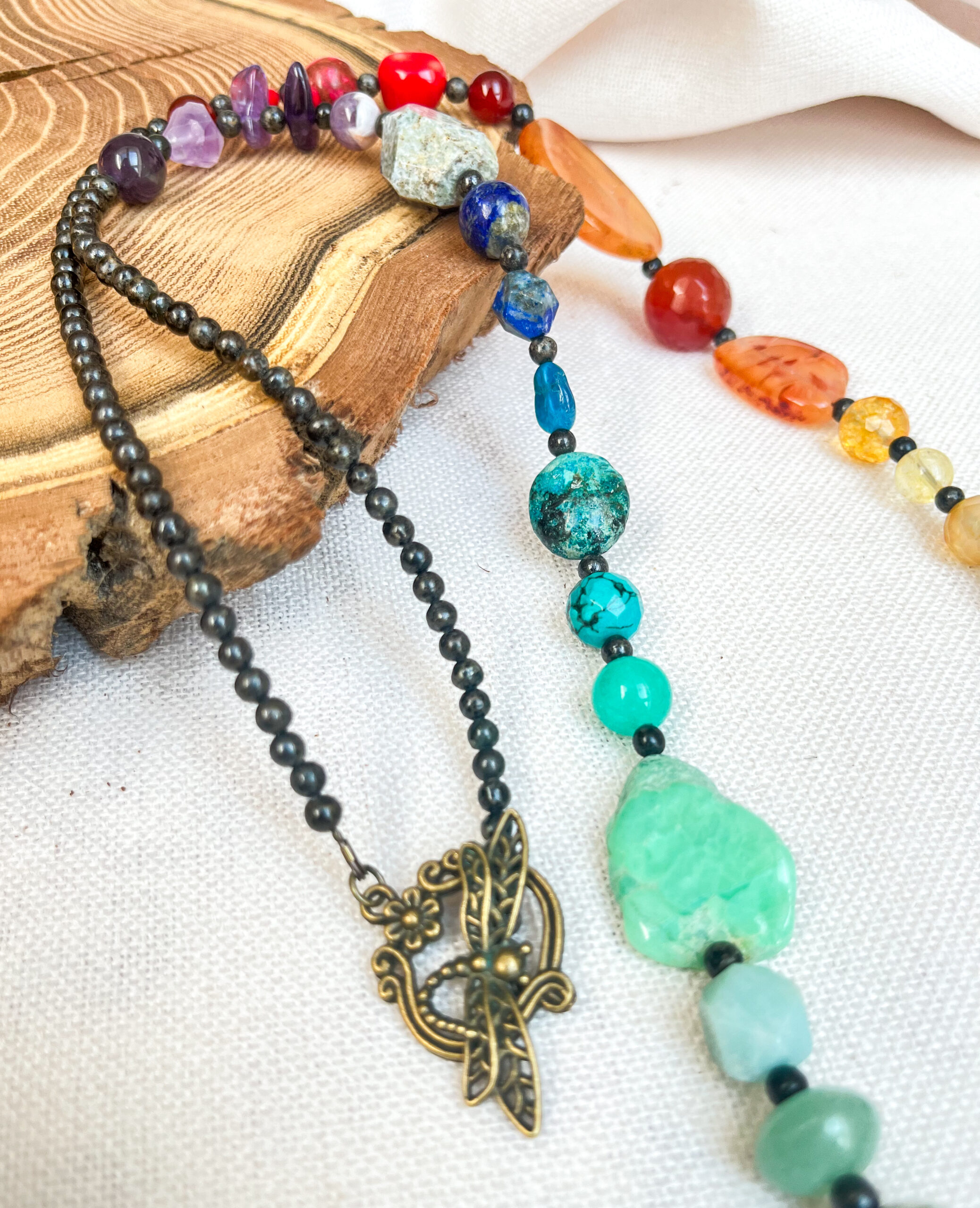Ez a nyaklánc a teljesség és az egyensúly szimbóluma. Az ékszerben a csakrák színeit követő ásványok sorakoznak, amelyek finom energiájukkal támogatják a test, a lélek és a szellem harmóniáját. Az alapot adó pirit az erő és a bőség köve, amely megalapozza és felerősíti a többi ásvány energiáját. Ez az ékszer azoknak szól, akik szeretnék érezni, hogy minden energiaközpontjuk támogatást kap, és hogy a belső világuk összhangban van a külvilággal.